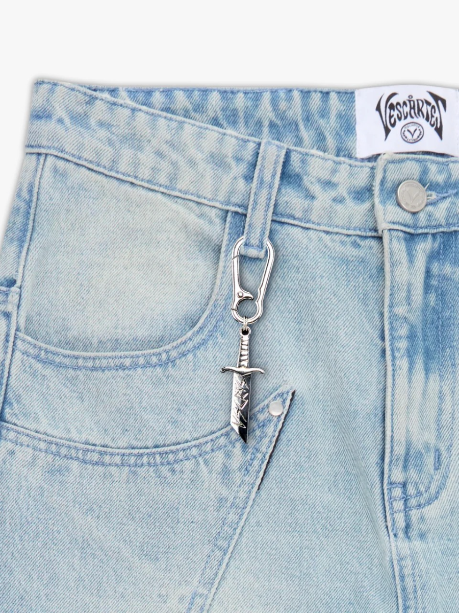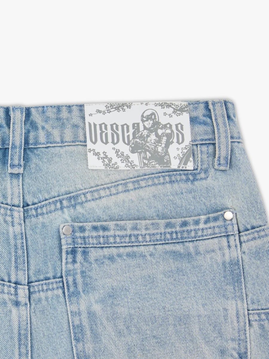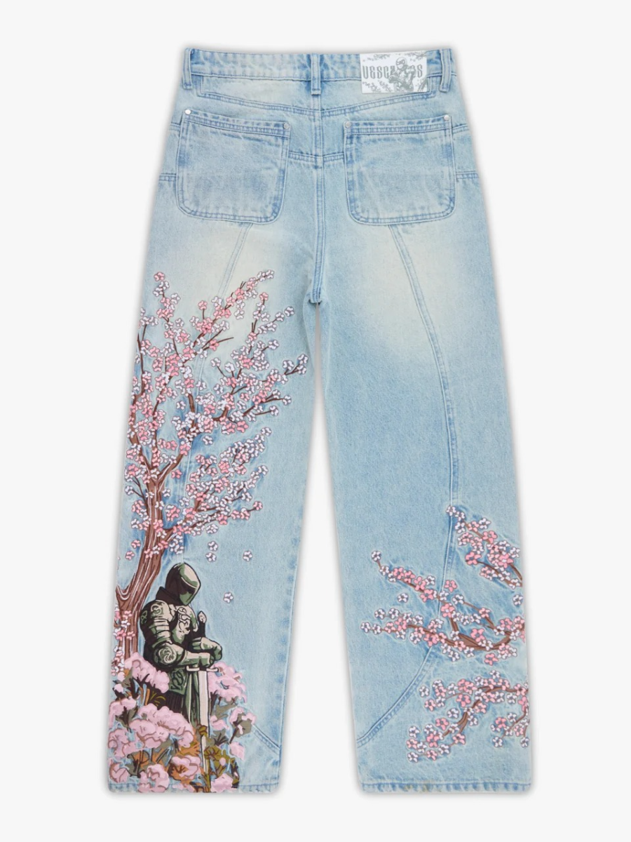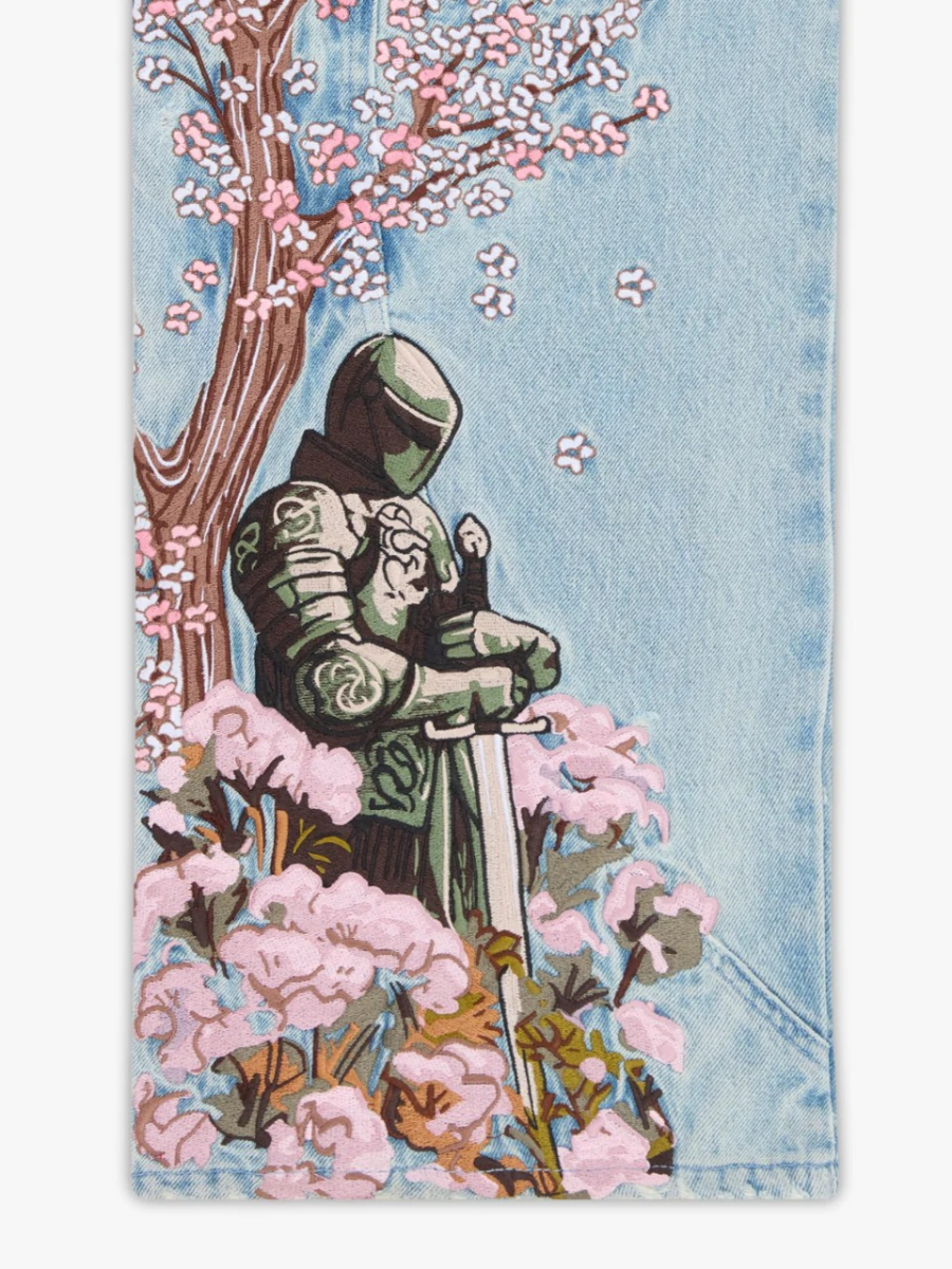 Crafted in a washed light blue finish with custom panelling on the front and back. Back embroidery depicting a knight beneath a blooming cherry blossom tree, with branches extending to the front panels. Finished with a custom leather tab, metal sword carabiner & 1,000,000+ stitches.